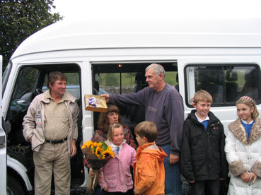 Presentation to Bill & Mick Wilkinson A presentation was made in Buckden Car Park to Bill & Mick Wilkinson who have run the Upper Wharfedale School Bus service for some 40 years. They were presented with clocks, vases and cards by some of the children, as an expression of gratitude for their many years of service to the community. |