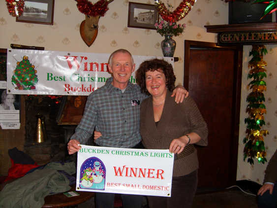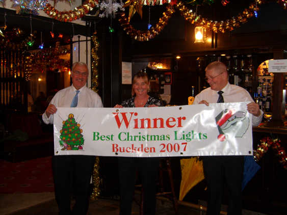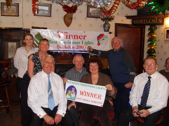 This years Christmas Lights Competition was more closely fought than in previous years due to the hard work of the Committee who responded well to criticisms of the 2006 event. This resulted in there being more than one entry. Congratulations to The Buck Inn who took the Supreme Champion Award, in their first year of competition - a remarkable performance. Gordon & Sandra Kilvington won the newly instituted "Best Small Domestic" category. For details of winners in all the categories please click here. Scroll down to see more pictures of the winners and their astonishing displays. |