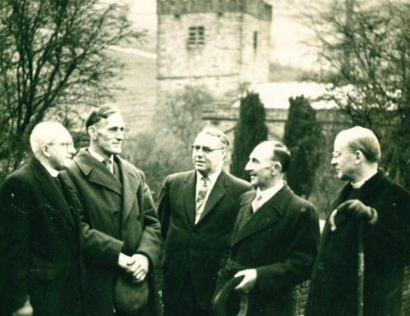 The picture below recreates a photograph from 1961 when Bishop Nick's predecessors - Dr Donald Coggan - came to Hubberholme and was photographed with the churchwardens. Dr Coggan subsequently became Archbishop of Canterbury. |