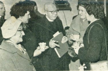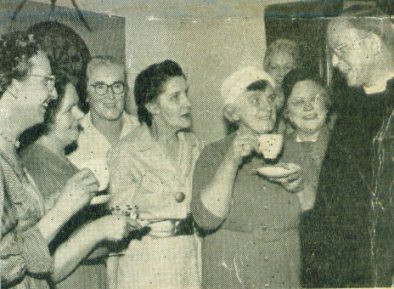 | Tea was served in the Institute afetr the Induction Service. Here Dr. Coggan is seen talking to parishoners. |