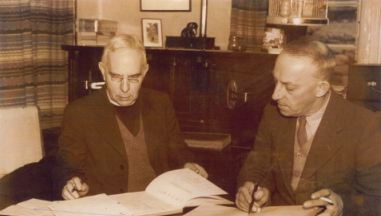 | Dr Coggan talking to Mr. Arthur Hannam. Arthur Hannam was a bank manager from Skipton, who ran a sub-office of his bank in Buckden Institute on Thursday mornings. |