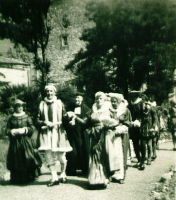 | Procession from Buckden House to the Green. The Vicar - The Rev. Isherwood - can be seen 3rd from left, playing the role of the Parish Priest. |